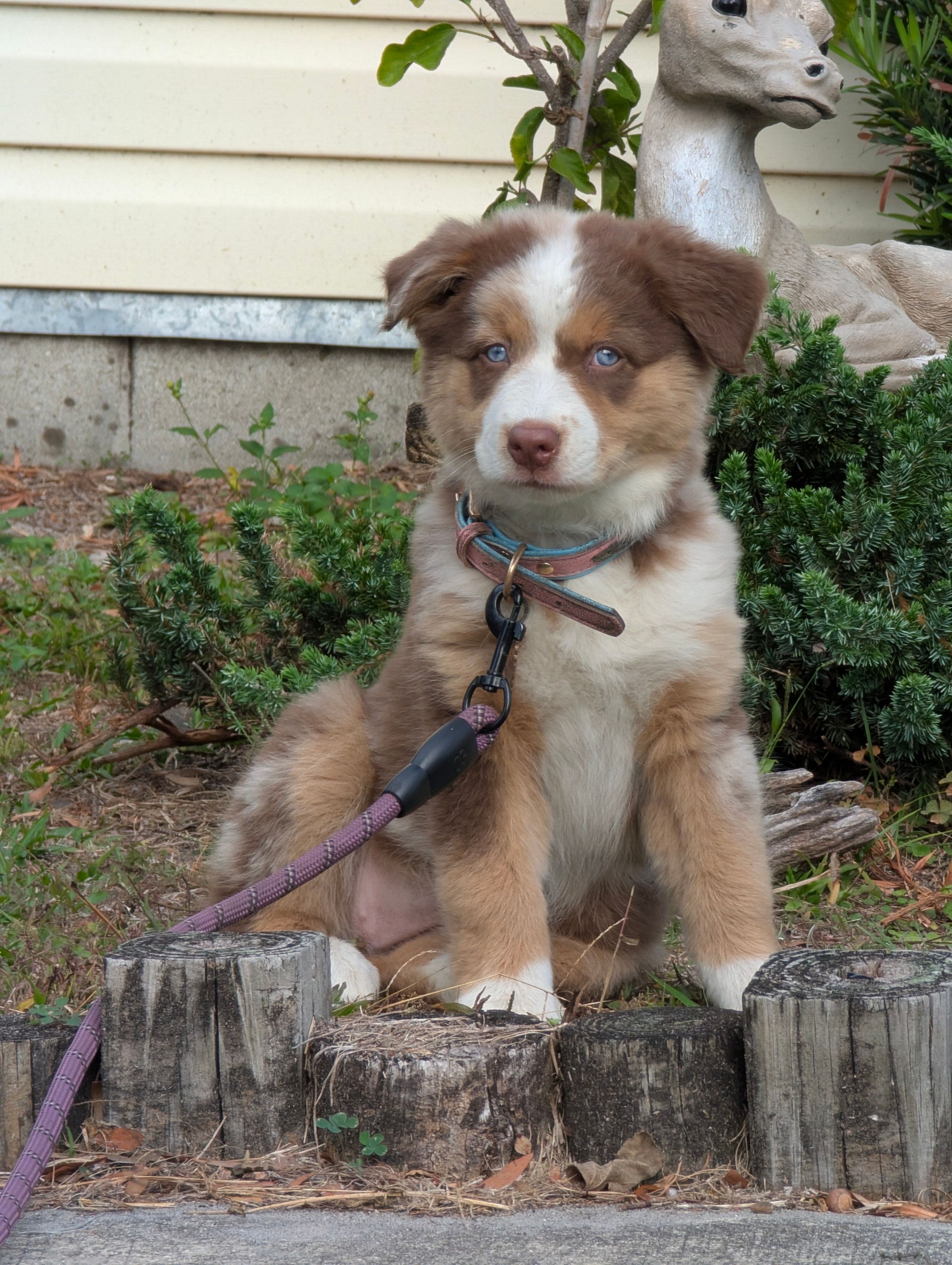 Genna is a stunning red merle Standard Australian Shepherd with bright beautiful blue eyes. Geena is energetic and sweet, always insisting on being petted but also comfortable with going off and being independent. Genna is an intelligent girl, learning quickly and understanding her place within the pack. Genna just turned 1 years old this past October 18th, 2025. She is filling out nicely. Her parents were both service dogs for their owner. Genna is from GA and has been with us since she was 8 weeks old.